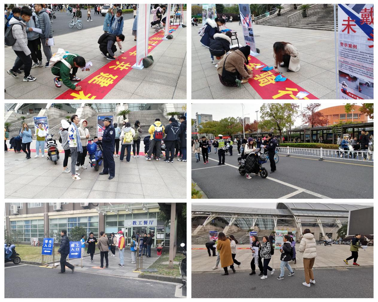 工作人员们在现场劝阻骑电动自行车不戴头盔、带人等违规行为的学生,交警开展批评教育和交通普法,保卫处人员宣讲校内电动自行车管理举措。违规学生都意识到错误,在横幅上签名承诺,表示今后一定遵守交通法规和校纪校规。