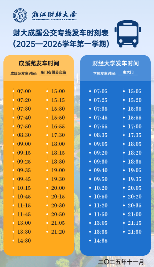 结合学生问卷调查结果和反馈意见,在前期试运行基础上,经与区公交公司沟通协调,统筹学校课时安排和人员峰值情况,现就成蹊公交专线发车时刻表调整如下: